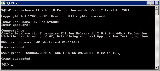 Login to SQLPlus as sys user and run the following: create user fcm identified by welcome1; grant RESOURCE, CONNECT, CREATE SESSION, CREATE VIEW to fcm;