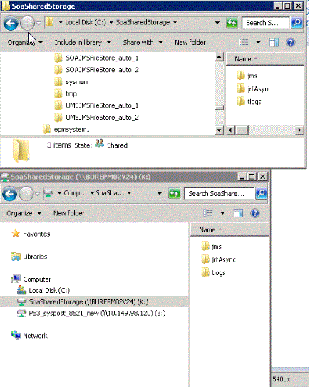 Create a folder in one of the SOA nodes and share that for all other SOA nodes. From all nodes map theshared folder to one of the drives, and make sure to use the same drive letter in all nodes, including the server that has folder. In this folder, create three sub-folders as “jms”, “tlogs” and “jrfAsync”. These will be used during Configuring a Shared JMS Persistence Store setup.