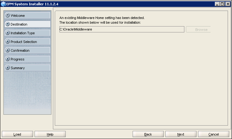 On the Destination screen, select the location for the Middleware Home directory, and click Next. The default directory is c:\oracle\middleware.