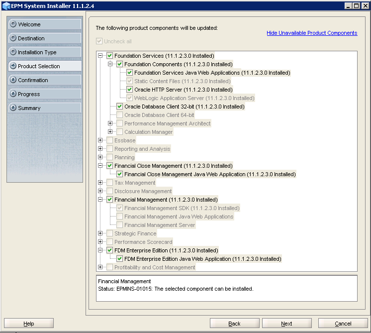 On the Product Selection screen, select Foundation Components under Foundation Services, Financial Close Management, FDM Enterprise Edition, (“Oracle Database Client-32 bit”, “Oracle Database Client-64 bit” under Foundation Services & Financial Management SDK under Financial Management will be auto-selected) and click Next.