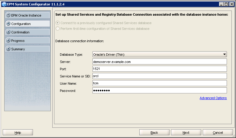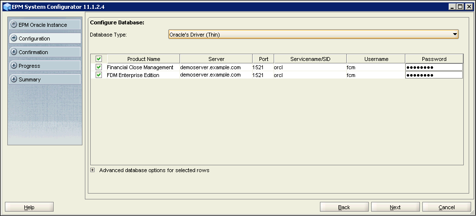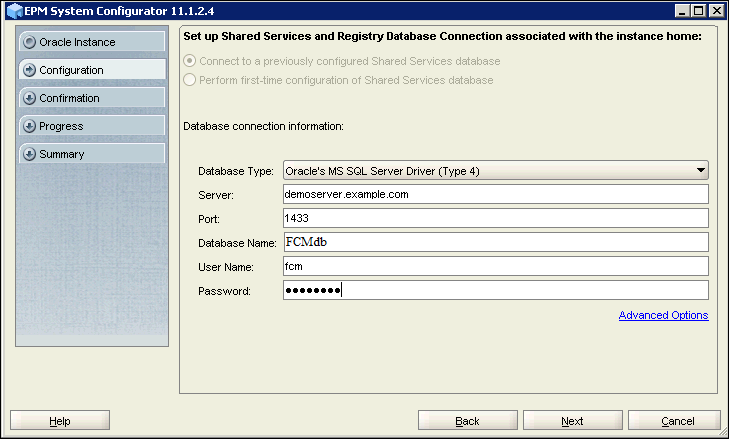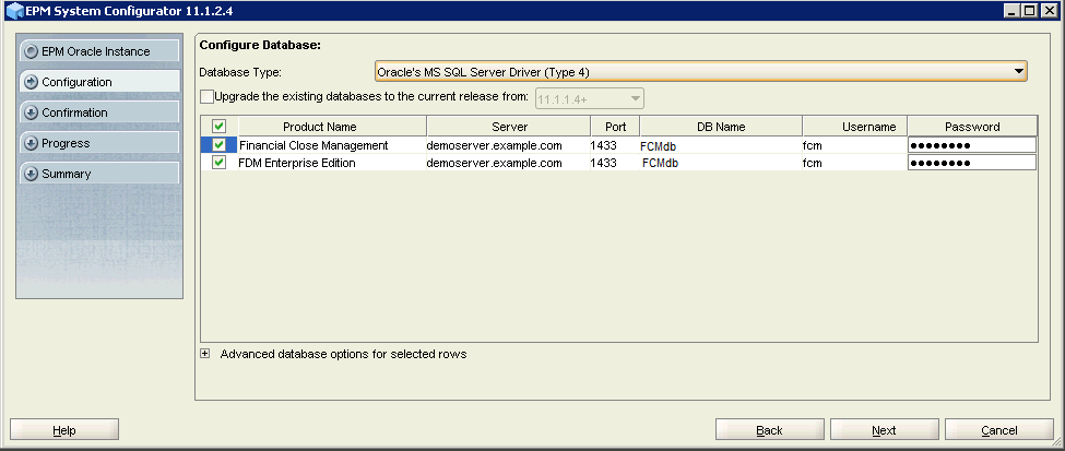 You will see the database connection details that were provided in Shared Services database connection details screen. Verify the connection details for the Financial Close Management and FDM Enterprise Edition database, and click Next.