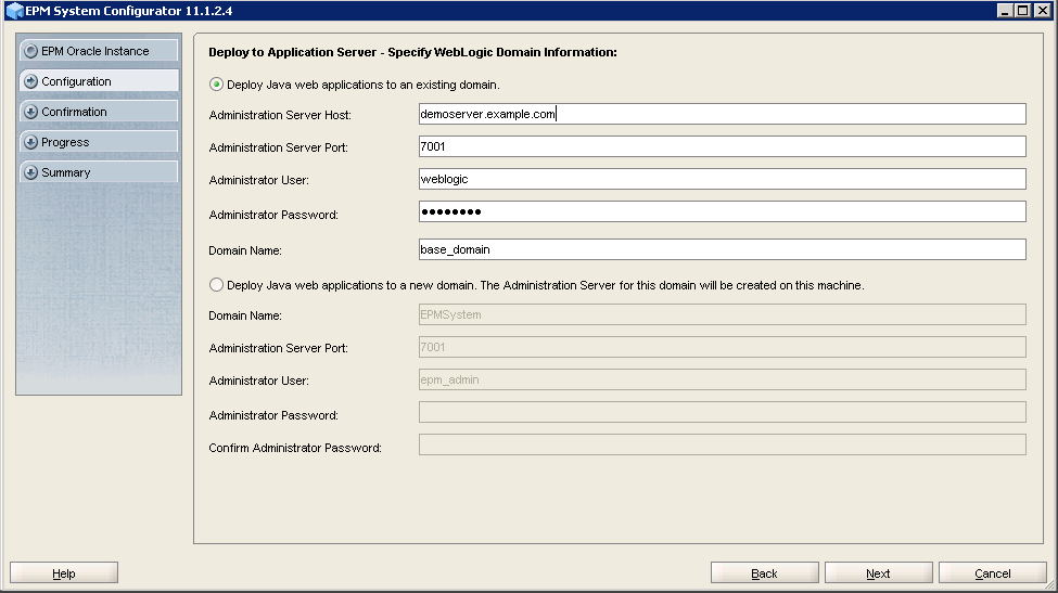 Select Deploy web applications to an existing domain, enter the information for the WebLogic domain that you created when you configured SOA, and click Next.