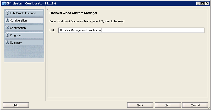 If you want to integrate Oracle Enterprise Content Management with your Financial Close Management application, enter the URL for Oracle Enterprise Content Management, and click Next.
