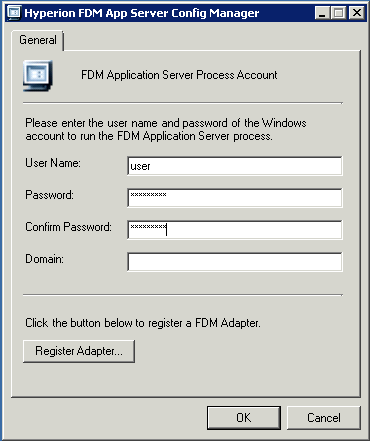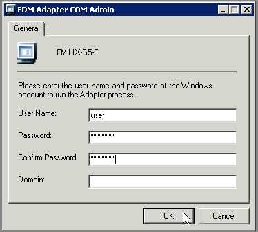 Enter the user name and password of the Windows account under which the application server DCOM objects run, and click OK. Note: The Windows account must have full control permission for the FDM application folders that reside on the data server, as well as rights to the target system.