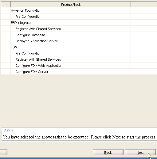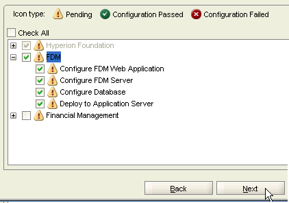 Select FDM, and click Next. Note: Oracle® Hyperion Financial Data Quality Management ERP Integration Adapter for Oracle Applications, Fusion Edition (ERP Integrator) is installed with FDM.