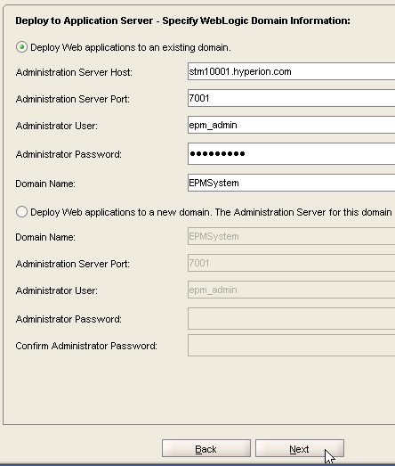 On the Weblogic Domain Information panel, select Deploy Web applications to an existing domain, and click Next.