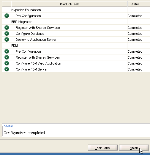 On the Summary panel, confirm that all configuration tasks were completed successfully, and click Finish to close EPM System Configurator.