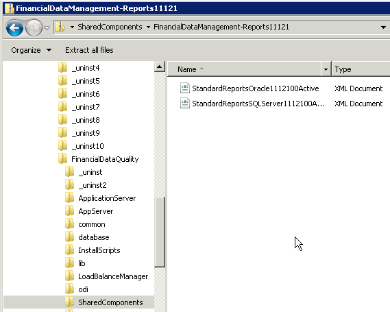 Navigate to the EPM_ORACLE_HOME/products/FinancialDataQuality/SharedComponents directory and open the FinancialDataManagement-Reports11121.zip file. This ZIP contains the standard reports files for use with Oracle or SQL Server databases.