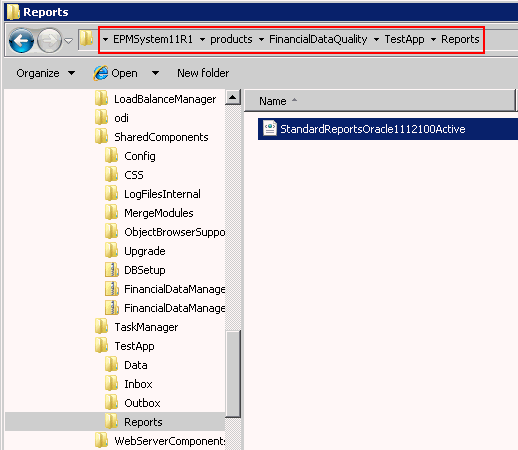 Extract the reports file for your database to the EPM_ORACLE_HOME/products/FinancialDataQuality/TestApp/Reports folder. In this tutorial, you extract the StandardReportsOracle1112100Active.xml file.