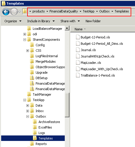 Extract the templates file to the EPM_ORACLE_HOME/products/FinancialDataQuality/TestApp/Outbox/Templates folder.