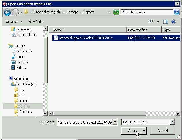 Browse to where you unzipped the StandardReportsOracle1112100Active.xml file, and click Open.