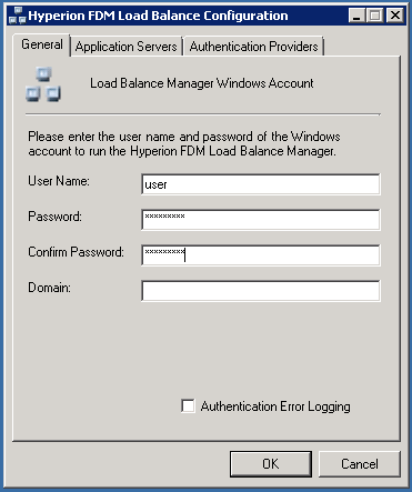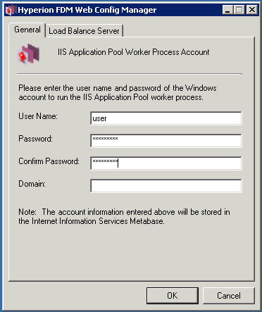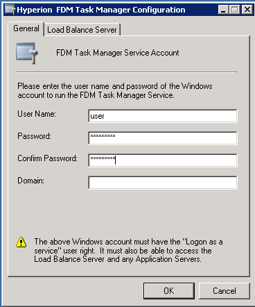 Enter the user name and password of the Windows account under which the Load Balance Manager DCOM objects run. Note: The Windows account must have full control permission for the FDM application folders that reside on the data server, as well as rights to the target system.
