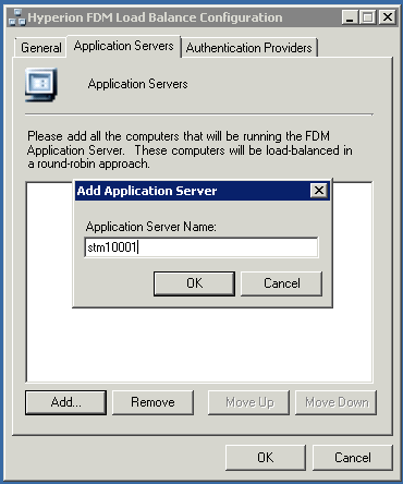On the Application Servers tab, click Add, and enter the names of all servers that run the FDM Application Server component.