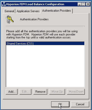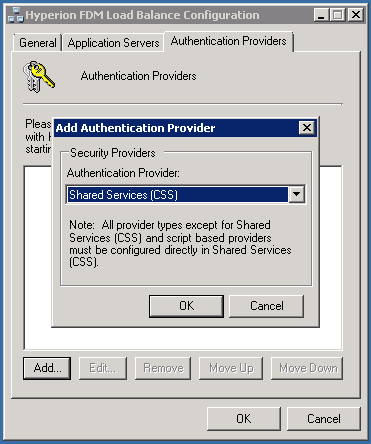On the Authentication Providers tab, click Add, and select the authentication provider that you will use for FDM. You can add Visual Basic Script (VBScript), Single Sign-on script (SSO script), and Common Shared Services (CSS) as authentication providers. In this tutorial, you select Shared Services (CSS).