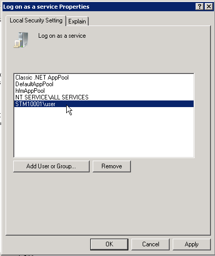 In the "Log on as a service Properties" dialog box, perform these actions: