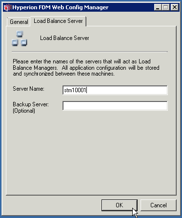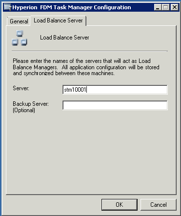 The load balance server is the computer that stores FDM application configurations and performs load balancing on FDM application servers. You may also specify a backup load balance server.