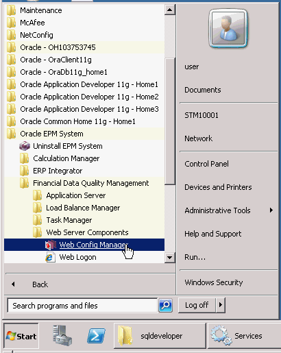 Select Start, then Programs, then Oracle EPM System, then Financial Data Quality Management, then Web Server Components, and then Web Config Manager.