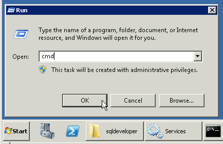 Select Start, and then Run, type cmd, and click OK to open a command prompt.