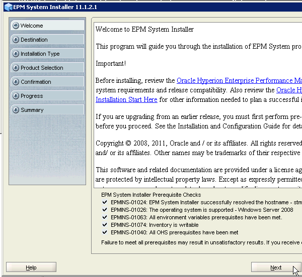 On the Welcome page of EPM System Installer 11.1.2.1, verify that the installation prerequisites have been met, and click Next.