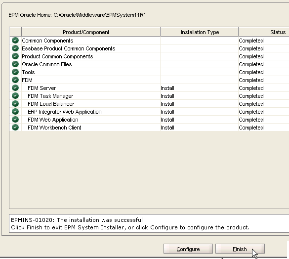 Confirm that all components of FDM were installed successfully, and click Finish to close EPM System Installer.