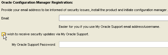 On the Oracle Configuration Manager Registration panel, clear the "I wish to receive security updates via My Oracle Support" checkbox, and click Next. Note: In a production environment, Oracle recommends that you specify the contact information to use for notifications from My Oracle Support and Oracle Configuration Manager.