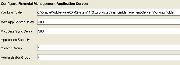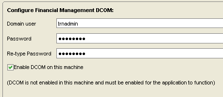 On the Financial Management DCOM panel, specify the Distributed Component Object Model (DCOM) account information to configure DCOM security, and click Next. You must specify the Windows administrator under whose identity the application server processes are launched. All Financial Management application server processes are run under the specified Windows administrator, so no other administrator is required to log on to the application server to start the application server processes.