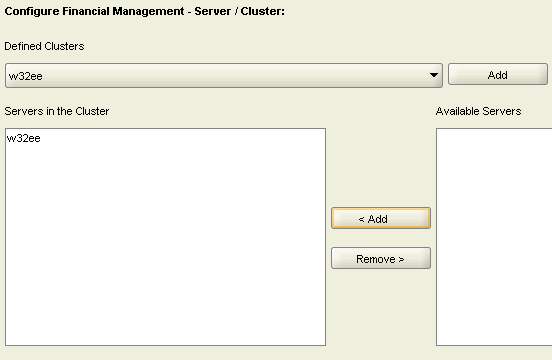 On the Financial Management Server/Cluster configuration panel, specify the application cluster and the names of the servers that participate in the cluster, and click Next. An application server cluster is a set of application servers that run the same application. Clustered application servers provide load balancing and failover capability and enable the servers to be transparently maintained while applications remain available for users.