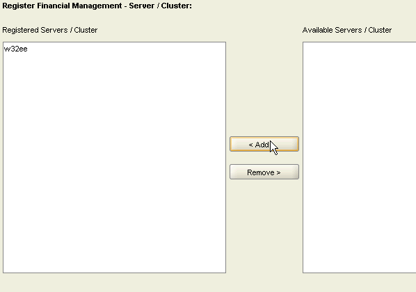 On the Financial Management Server/Cluster registration panel, perform the following actions: