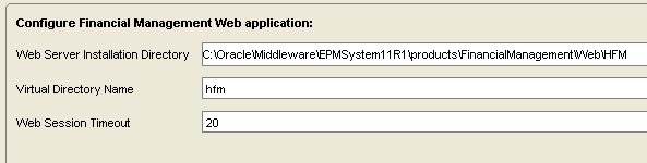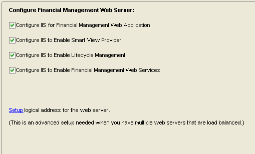 On the Financial Management Web Server configuration panel, specify the components that you want to enable as Web applications in IIS or accept the default values, and click Next.