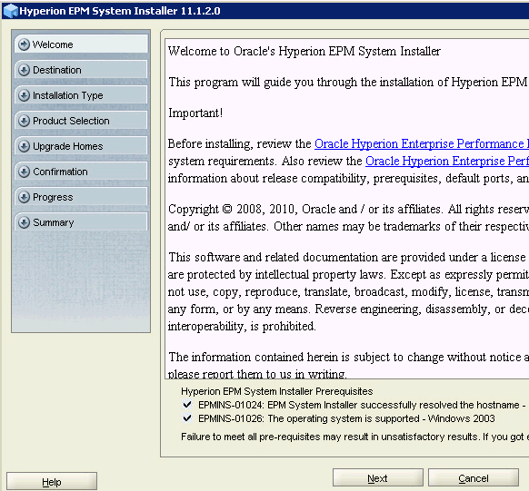 On the Welcome panel, verify that the system prerequisites were met, and click Next.