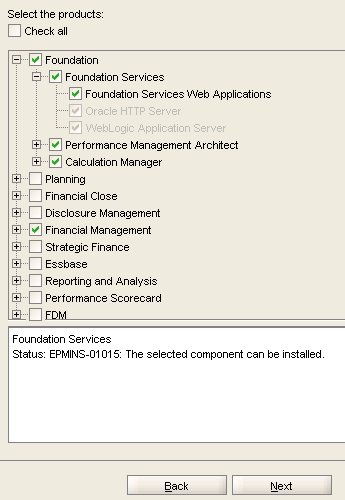 On the Product Selection panel, select the products that you want to install, and click Next. In this example, you install Foundation Services and Financial Management.