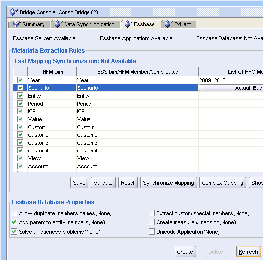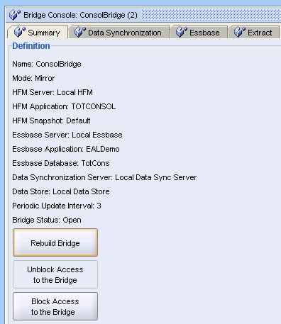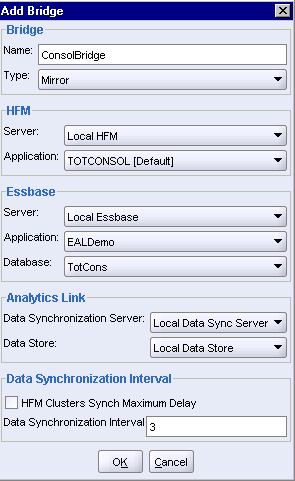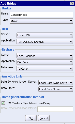 Enter the following information: a) In the Name field, enter a name for the bridge. b) In the Type list, select Mirror. c) Select a Financial Management server and application. d) Select an Essbase server, application, and database. e) Select a Data Synchronization Server and Data Store.