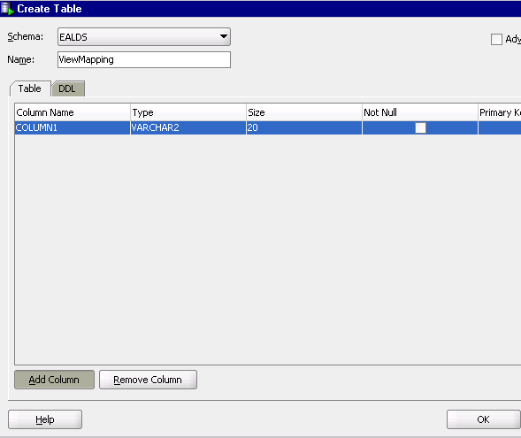 Perform the following actions: a) In the Schema list, select a schema. (EALDS is selected in this tutorial.) b) In the Name field, enter a name for the table. (In this tutorial, a table named "ViewMapping" is created for the View dimension.) c) Click Add Column.