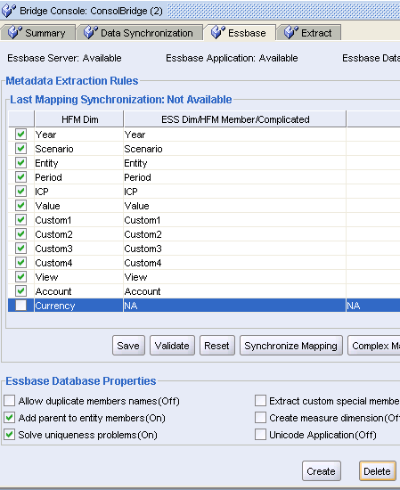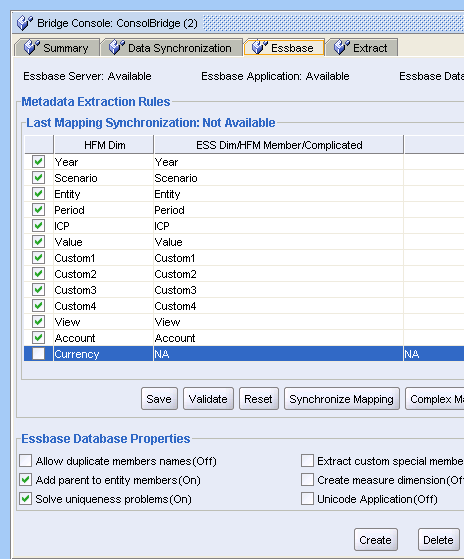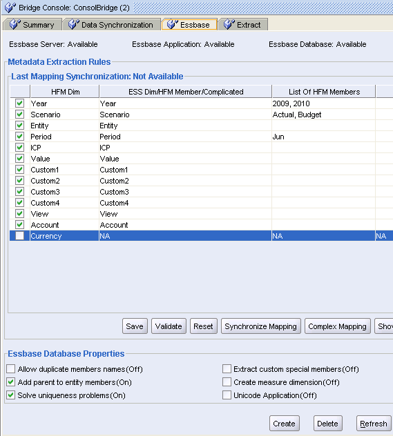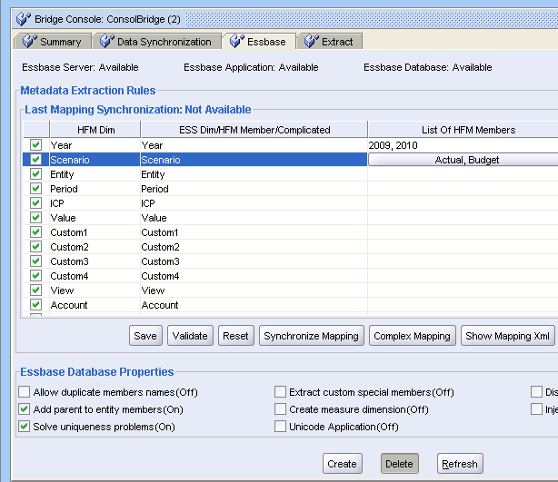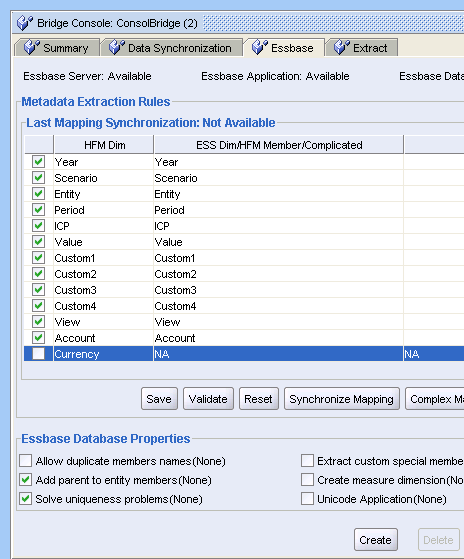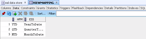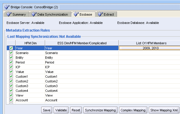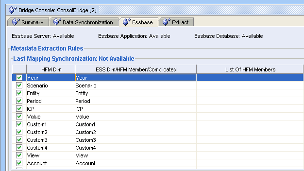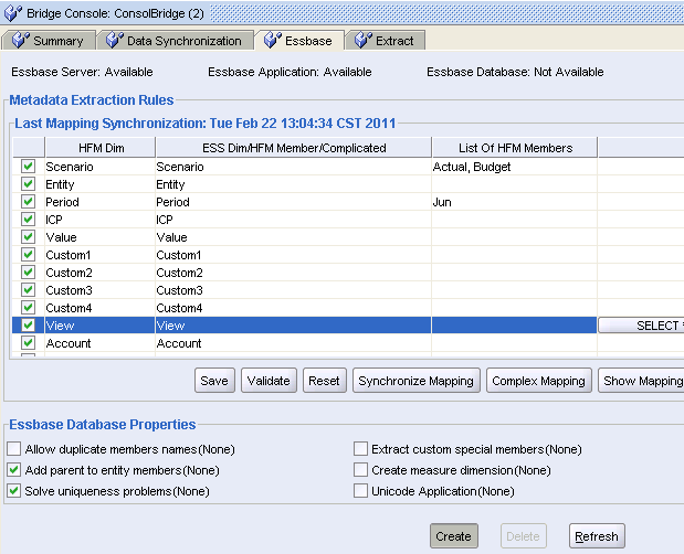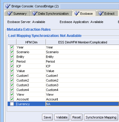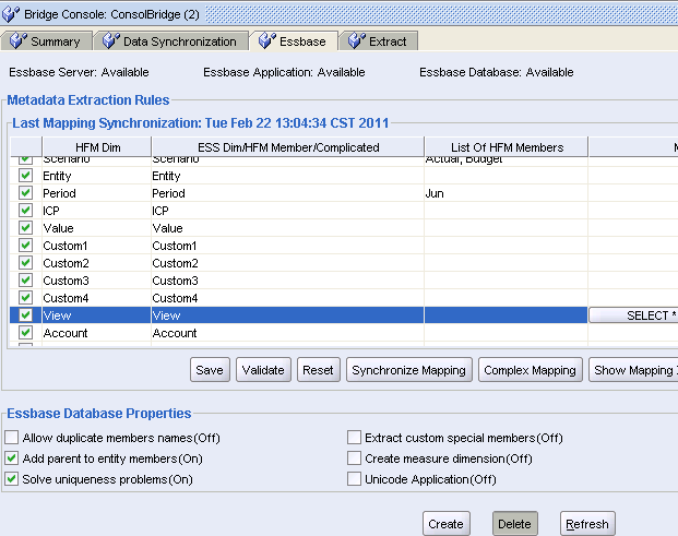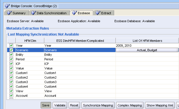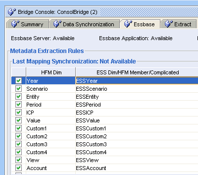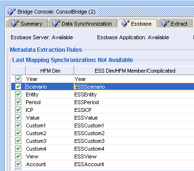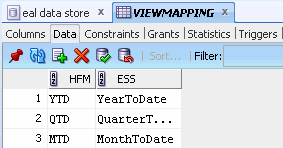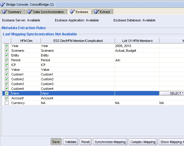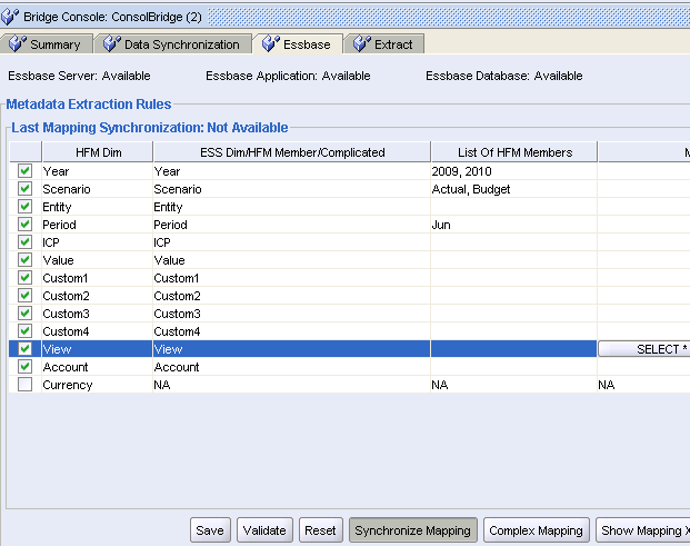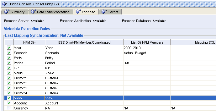 Navigate to the Essbase tab of the bridge console and under Metadata Extraction Rules, perform the following actions: a) Select the dimension with the changed member names. (In this tutorial, it is the View dimension.) b) In the View row, double-click the field in the Mapping SQL column.