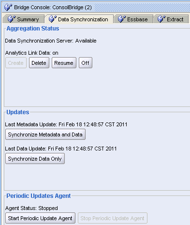 Click Start Periodic Update Agent. Based on the update interval specified (in seconds), Analytics Link automatically synchronizes the Data Synchronization Server with any changes in the Financial Management data. Note: After starting the periodic update, you cannot manage the Analytics Link application: that is, you cannot create, delete, resume, or disable the application.