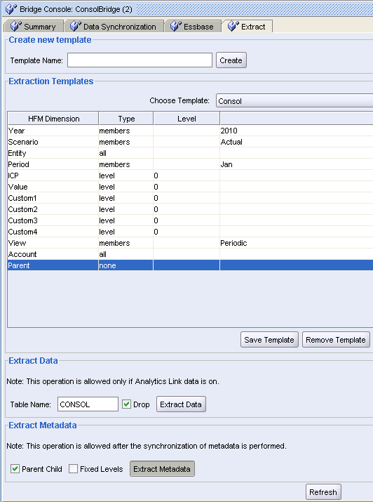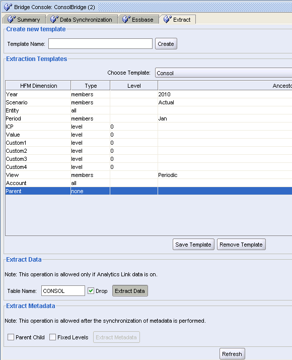 When extracting data, you can choose to append to, or drop data from, a previous extraction. You can also create extraction templates that are useful when performing the same extraction multiple times. Extraction templates are stored in the Analytics Link repository.