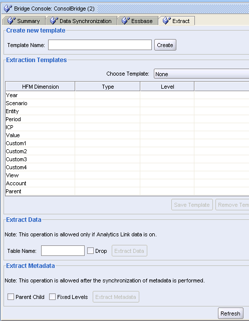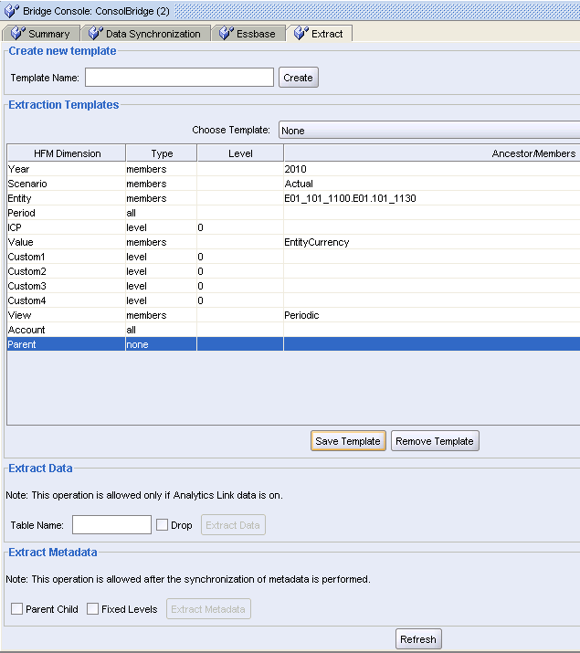 Perform the following actions: a) In the Template Name field, enter a name for a template, and click Create. b) Under Extraction Templates, in the Type column, specify a type for each Financial Management dimension. c) Click Save Template.