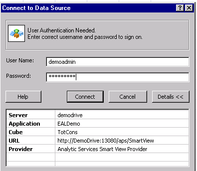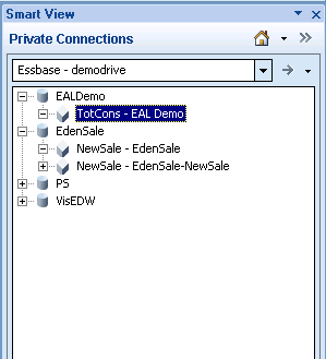 In Smart View, connect to the TotCons-EAL Demo Essbase application.