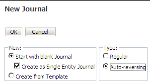 Perform the following steps: a) Select Start with blank Journal. b) Under Type, select Auto-reversing. c) Click OK.