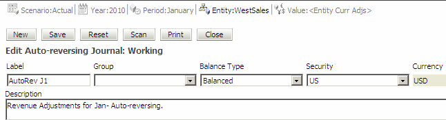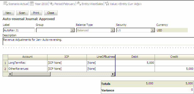 In this part of the tutorial, you create an auto-reversing journal entry in the WestSales entity. The entry is for February revenue that was incorrectly credited in January 2010.