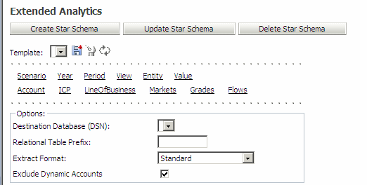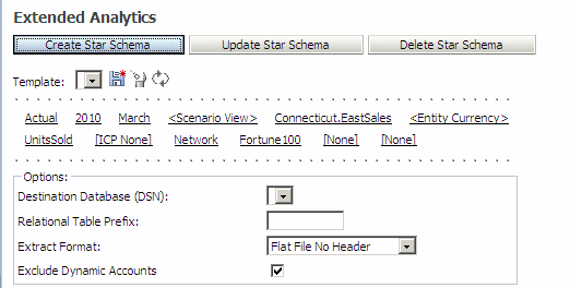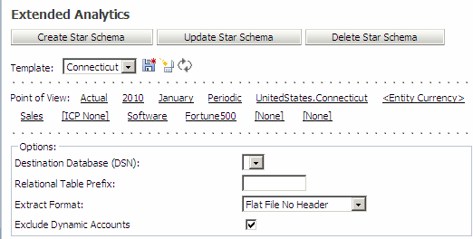 Under Options, perform the following actions: a. In the Extract Format list, select Flat File No Header. b. Select Exclude Dynamic Accounts to exclude data for dynamic accounts. c. Click Create Star Schema. d. Optional: Click Update Star Schema to export data to an existing star schema.