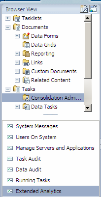 In the Browser View pane, select Tasks > Consolidation Administration > Extended Analytics.
