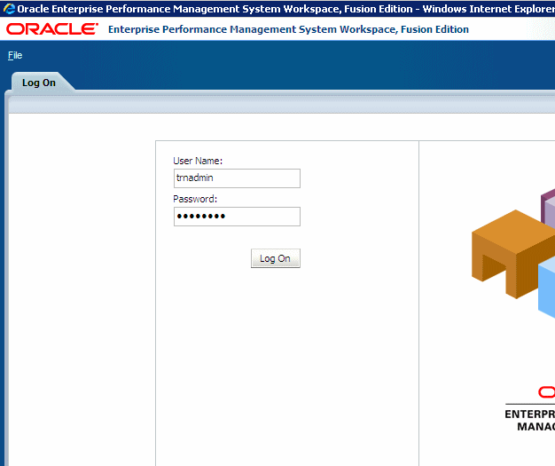 On your desktop, perform the following actions: a. Double-click the Workspace icon. b. Enter user name trnadmin and password hyperion. c. Click Log On to log on to Workspace.