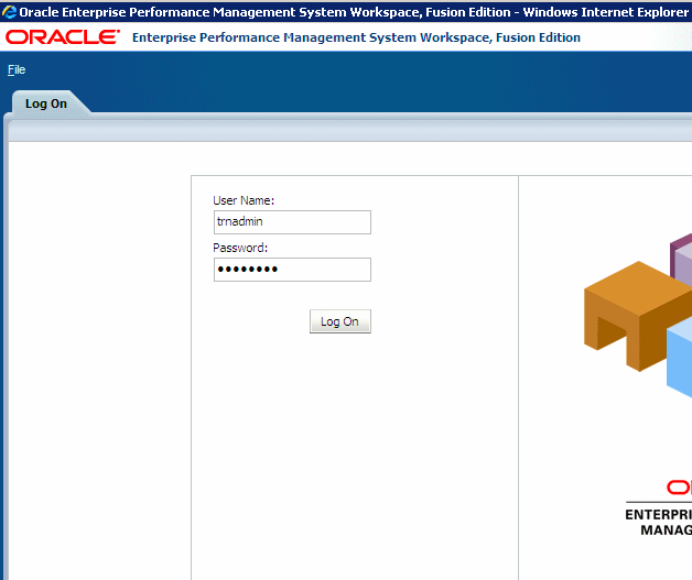 On your desktop, double-click the Workspace icon, enter user name trnadmin and password hyperion, and click Log On to log on to Workspace.