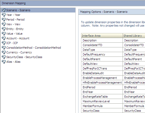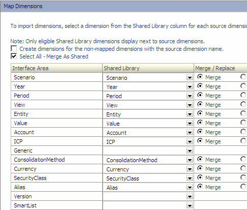 Enter the following details to map the dimensions: a) For each dimension in the Interface area, enter the following dimensions in the Shared Library column: