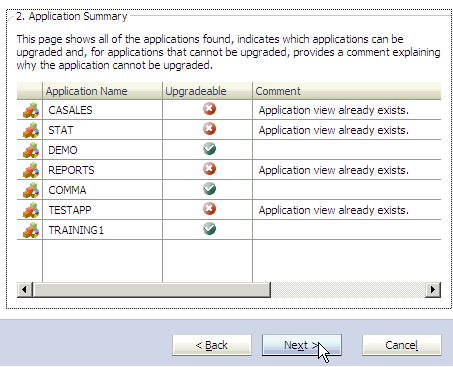 Review the applications on the Application Summary page, and click Next. The Application Summary page displays a list of all applications and indicates which applications can be upgraded.