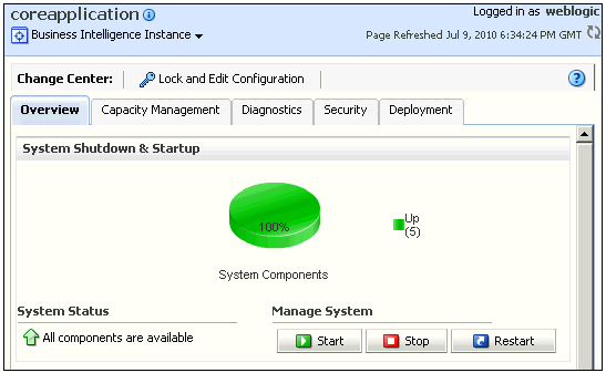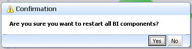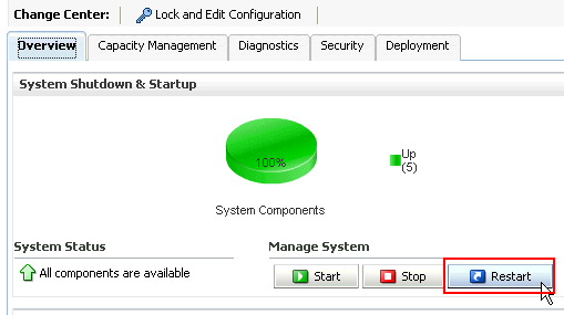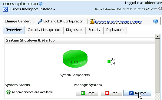On the Overview tab, click Restart. Note: You can also restart by running the opmnctl.bat file located in C:\OBIEE\instances\instance1\bin.