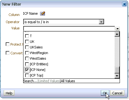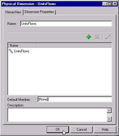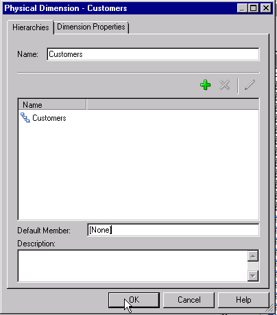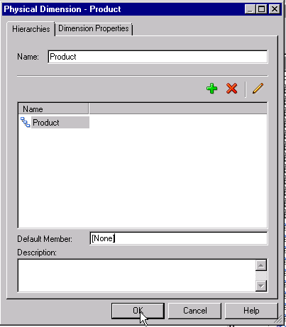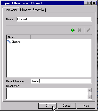 In the Default Member field, enter [None], and click OK. Note: When you build an analysis, if you do not specify a member for a dimension, the default member is used. In this tutorial, you set the default members for the four custom dimensions to [None].