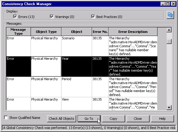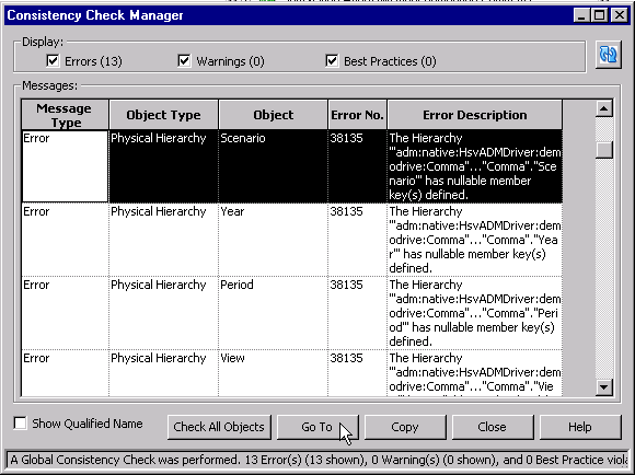 Note: When you run the global consistency check, you must mark the primary keys of the Physical Hierarchy objects as nullable in Consistency Check Manager. This is a known issue in the 11g release, and it will be fixed in a later release.