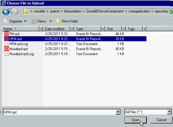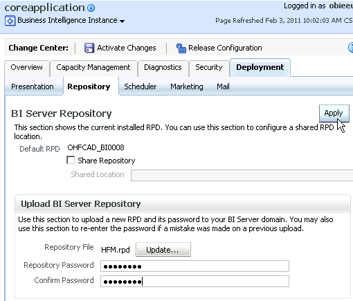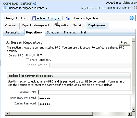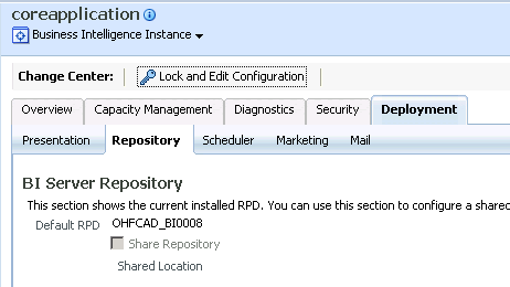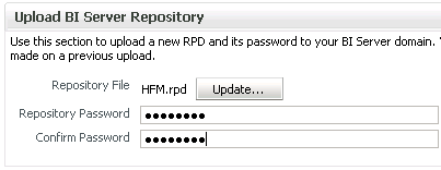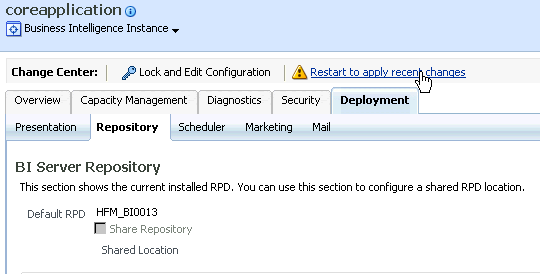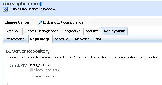 In the BI Server Repository section, confirm that the Default RPD is now HFM with an extension. In this example, the file name is HFM_BI00013.